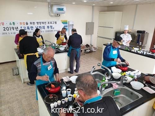 전문 강사(조리사) 및 자원봉사자의 지도로 실시 된 ‘고독한 남자의 부엌’에서는 10여 가지의 요리 실습과 영양관리 교육이 진행됐으며 남성 홀몸 어르신들이 직접 조리하고 음식을 만들어 개인용 용기에 담아 집으로 가지고 가기도 했다.