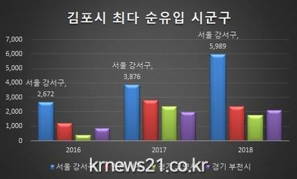 김포시는 최근 3년간(2016~2018) 김포시로 순유입(전입-전출)된 인구를 분석한 결과 서울로부터의 유입인구가 가장 많았다고 밝혔다.