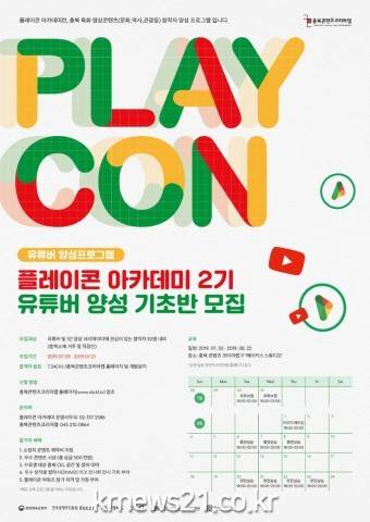 ▲ [사진=홍보포스터]청주시 첨단문화산업단지에 있는 충북콘텐츠코리아랩이 ‘플레이콘 아카데미 2기 유튜버 양성 기초반’을 7월 21일까지 모집한다.