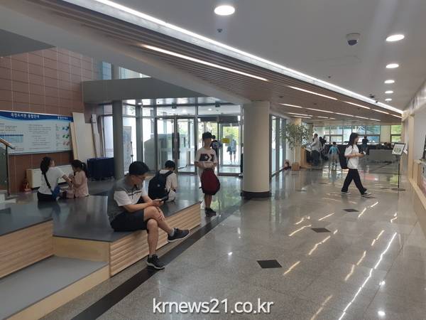 우선 1층 로비에 휴게실과 매점을 구분하던 벽을 허물어 하나의 공간으로 연결했다. 이곳에 누구나 편하게 책과 신문을 읽고 노트북 등을 이용할 수 있도록 테이블과 데크형 벤치를 설치했다.