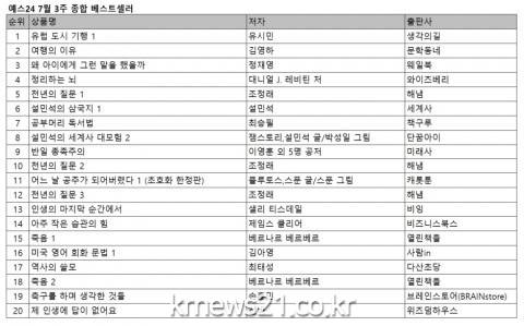 ▲ [사진=베스트셀러목록]예스24 7월 3주 종합 베스트셀러에서는 유시민 작가의 유럽 탐사 이야기 <유럽 도시 기행 1>이 한 계단 올라 새롭게 1위에 등극했고 작가 김영하의 산문 <여행의 이유>가 9주 연속 1위로 독주를 이어오다 전주 대비 한 계단 내린 2위에 올랐다. 아이를 좋은 대학에 보내고 난 뒤 뼈아프게 후회되는 것들을 담은 육아 반성기 <왜 아이에게 그런 말을 했을까>가 3위로 새롭게 얼굴을 내밀었고 뇌 신경과학 연구를 바탕으로 정보와 선택의 과부하로 뒤엉킨 머릿속과 일상을 정리하는 기술을 담은 <정리하는 뇌>는 유튜버 ‘라이프해커자청’을 통해 소개된 후 순위 역주행을 시작해 전주 대비 네 계단 올라 4위에 안착했다.