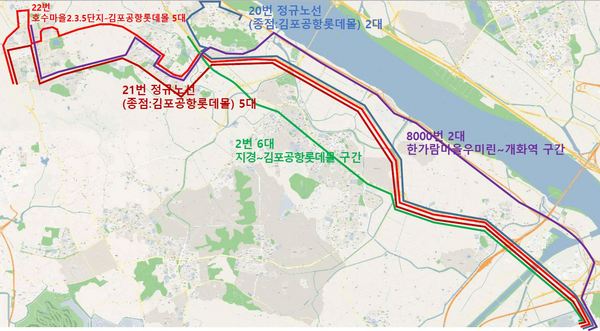 구체적으로는 2번 버스 6대(국내선, 송정역 미경유), 20번(국제선, 공항공사, 국내선 미경유) 2대, 21번(국제선, 공항공사, 국내선 미경유) 5대, 22번(국제선, 공항공사, 국내선, 송정역 미경유) 5대, 8000번 2대이며 출근시간 대 기존 버스 사이사이에 배차된다.