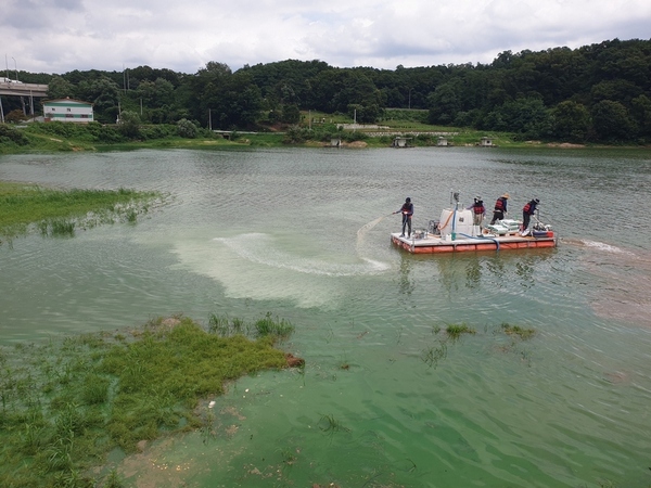 한국농어촌공사 안성지사(지사장 이상학)는 30일 지사 관내 운수저수지(원곡면 반제리, 수혜면적 120ha 총 저수량 399천톤)에서 녹조방제작업을 실시하였다.