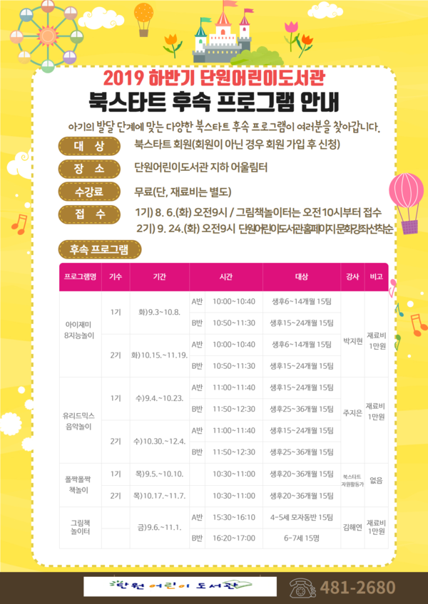 프로그램에 대한 자세한 문의 사항은 단원 어린이도서관 홈페이지 공지사항을 참고하거나 단원 어린이도서관(031-481-2680)으로 하면 된다.