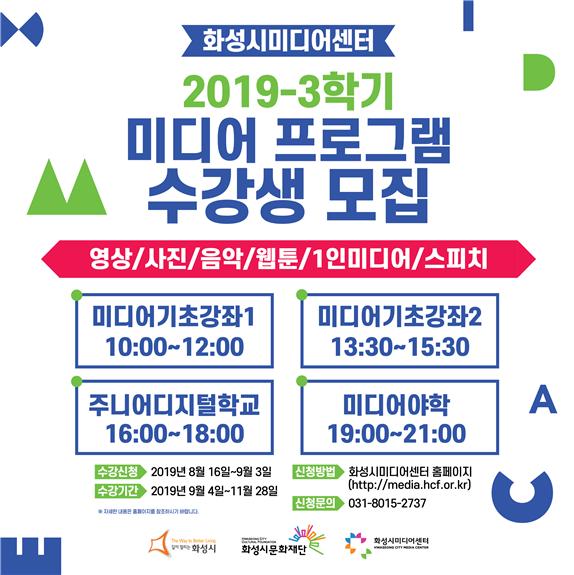 8월 16일 수강신청을 시작하는 2019년 3학기 미디어 정규강좌는 9월 4일 개강한다. 성인, 청소년, 어린이 대상 맞춤형으로 수강생을 모집하며, 수강료는 성인은 9만원, 어린이는 6만 원이다. 자세한 사항은 화성시 미디어센터 홈페이지(media.hcf.or.kr)에서 확인이 가능하다.