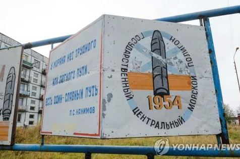 폭발사고가 발생한 러시아 아르한겔스크주 세베로드빈스 뇨녹사 군기지 내 광고판[로이터=연합뉴스]