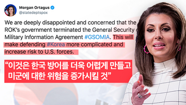 모건 오테이거스 국무부 대변인은 25일(현지시간) 자신의 트위터 계정에 올린 글에서 "우리는 한국 정부가 지소미아를 종료한 것에 대해 깊이 실망하고 우려한다"면서 "이것은 한국 방어를 더욱 어렵게 만들고 미군에 대한 위험을 증가시킬 것"이라고 말했다.
