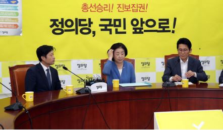 정의당 심상정 대표(가운데)와 윤소하 원내대표(오른쪽) 김후곤 법무부 기획조정실장(왼쪽)