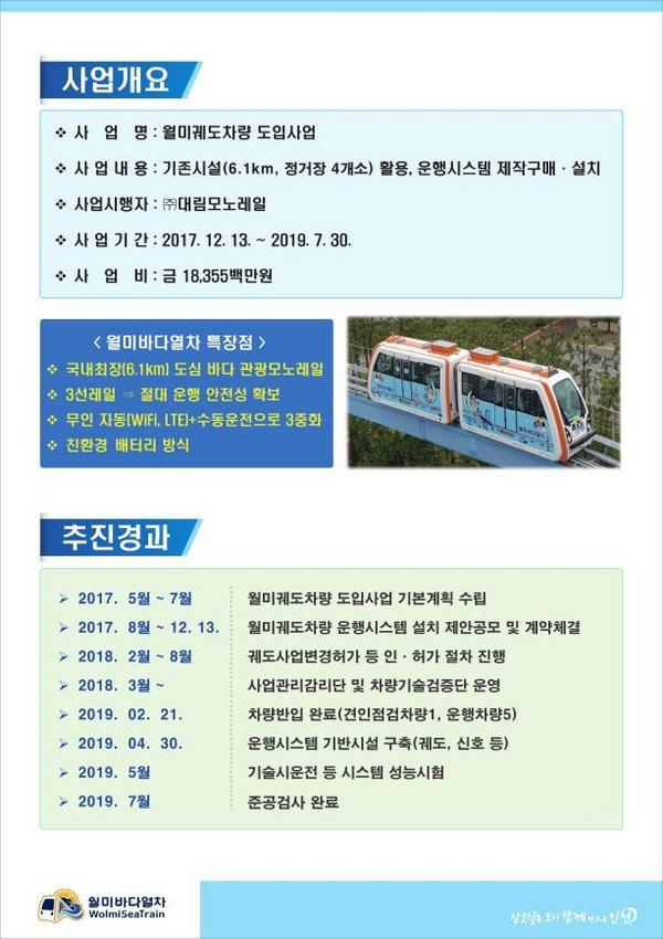 ○ 인천시(시장 박남춘)는 2009년 개통예정이었으나 안전성 문제 등으로 멈춰섰던 월미바다열차(옛 월미은하레일)가 10년 만인 올해 10월 8일 정식 개통한다고 밝혔다.