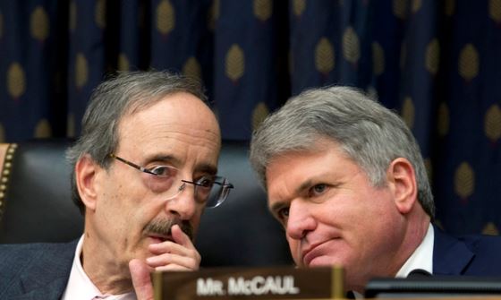 공화당의 마이클 맥콜 의원과 이야기하고 있다.