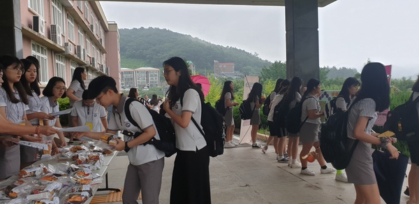 이날 청소년단체 관계자들과 청소년위원회 참여 학생들은 각 학교 앞에서 ‘좋아하는거 재밌는거 많이 하면서 신명나게 살아보자!’라는 문구가 적힌 응원 메시지와 함께 건강 응원 간식을 제공하며 격려했다.