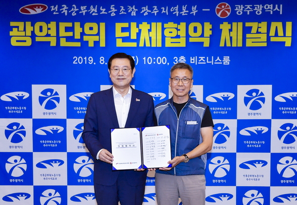 광주광역시와 전국공무원노동조합 광주지역본부는 30일 시청 비즈니스룸에서 5개 자치구를 포함한 시 전체 공직자의 권익 향상과 근무조건 개선, 조직문화 혁신 등을 위한 단체협약을 체결했다.
