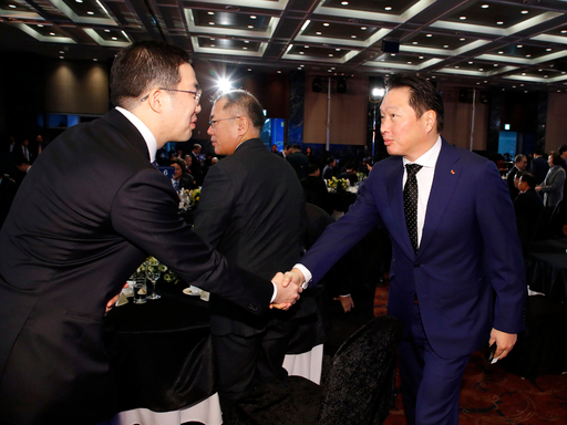 최태원 SK그룹 회장(오른쪽)과 구광모 LG그룹 회장이 지난 1월 2일 오전 서울 여의도 중소기업중앙회