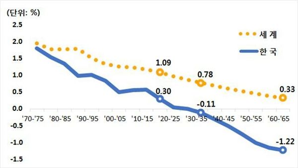한 여자가 가임기간(15-49세) 동안 낳을 것으로 예상되는 평균 출생아수인 합계출산율을 보면 2015~2020년 전세계 평균 2.47명으로 1970~1975년의 2.0명보다 44.8% 줄었다.
