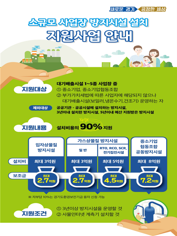 경기도는 ‘소규모 사업장 방지시설 설치 지원사업’을 75억 원에서 757억 원 규모로 10배 이상 확대실시할 계획이라고 4일 밝혔다.