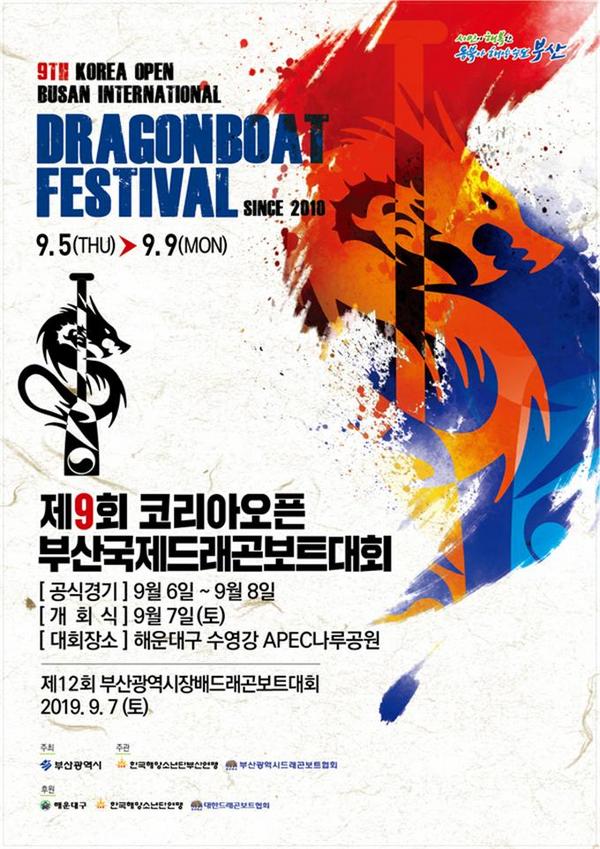부산시(시장 오거돈)가 주최하고, 한국해양소년단부산연맹과 부산시드래곤보트협회가 주관하는 「제9회 코리아오픈 부산국제드래곤보트대회(9.6~9.8)와 부산시장배 드래곤보트대회(9.7)」가 수영강 APEC나루공원 일원에서 열린다.