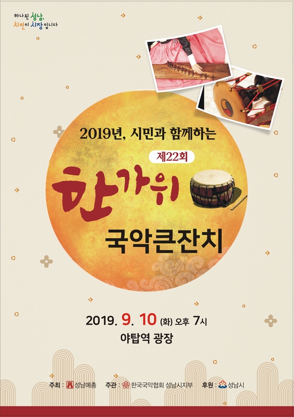 한국국악협회 성남시지부(지부장 이향우)는 ‘추석’ 한가위를 맞아, ‘제22회 성남 한가위 국악 큰잔치’를, 9.10(화) 오후 7시 시민들의 왕래가 잦은 야탑역 광장에서 개최한다.