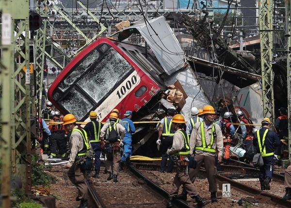 5일 일본 요코하마시에서 발생한 열차와 트럭 충돌 사고 현장