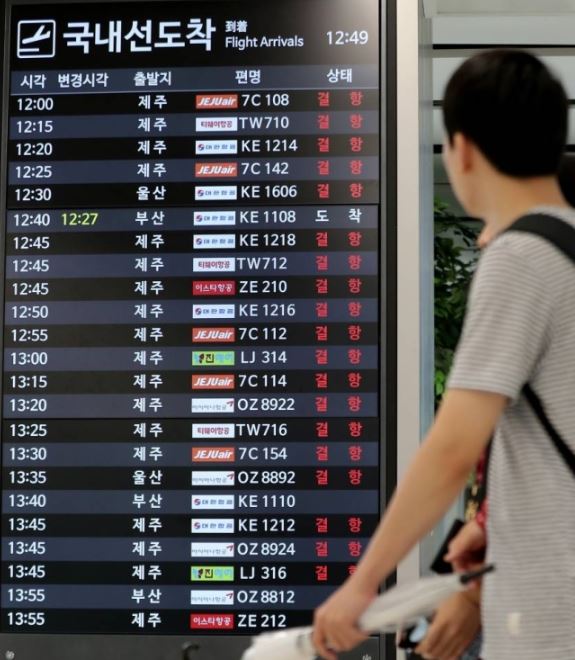제19호 태풍 '솔릭' 영향으로 23일 오후 서울 강서구 김포공항 국내선 도착장 전광판에 항공편