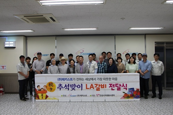안성시기업사회공헌단 ㈜테키스트는 지난 5일 안성시자원봉사센터와 연계하여 추석맞이 LA갈비 전달식을 진행했다. ㈜테키스트(대표이사 김춘호)는 추석명절을 맞이하여 나눔 문화 확산에 동참하기 위해 1500만원 상당의 LA갈비세트를 기부하였으며 관내 열악한 사회복지시설 19곳에 전달됐다. 김춘호 대표이사는 온가족이 맛있는 음식을 나누는 추석명절에 모두가 풍성한 한가위가 되길 바란다며 나눔을 통해 임직원들도 명절의 의미를 되새길 수 있는 뜻깊은 시간이었다고 말했다. 이진석 센터장은 즐거운 명절인 동시에 어려운 이웃들은 소외감을 느낄 수도 있는 추석이다면서 이웃을 생각하는 기업이 안성에 있어 매우 자랑스럽고 앞으로도 관내 기업들이 나눔 확산에 동참할 수 있도록 노력하겠다고 전했다. 한편 ㈜테키스트는 안성시 원곡면에 위치한 반도체 공정용 장비 등을 생산하는 기업으로 2015년부터 회사의 지속적인 성장에 발맞춰 김장봉사활동 물품후원 등 다양한 나눔을 통해 기업의 사회적 책임을 다하고 있다.