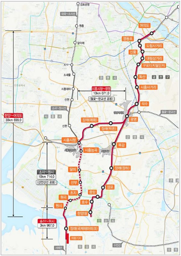 국토부와 경기도 등에 따르면 ‘신안산선’은 안산 한양대역에서 광명역을 거쳐 서울 여의도 역에 이르는 30여㎞ 구간과 장래역에서 시흥시청, 광명역으로 이어지는 13여㎞ 일부 구간을 포함, 총 44.7㎞ 구간을 잇는 복선 전철이다. 정거장 15개소와 차량기지(송산) 1곳도 신설된다.