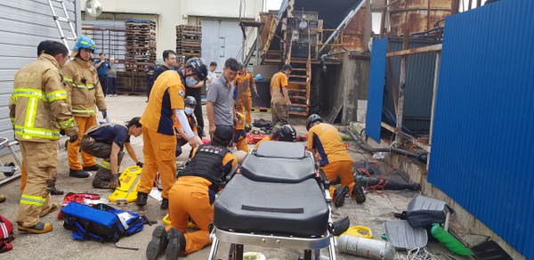 10일 발생한 영덕군 축산면 수산물가공업체 가스질식사고 현장에서 소방대원들이 다친 근로자들을 응급처치하고 있다.