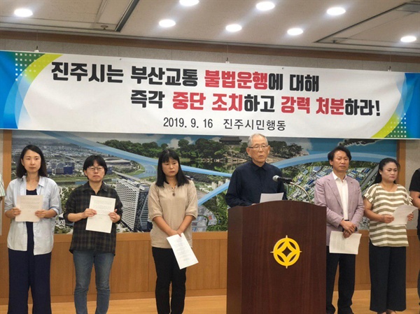 진주시는 지난 9월 16일 진주시민행동이 진주시청 브리핑룸에서 가진 기자회견 내용과 관련하여 부산교통 특혜 의혹은 있을 수 없는 일이라고 못 박고, 부산교통의 미인가 운행에 대해서는 과징금 부과 등 적법한 행정조치를 시행중이라고 밝혔다.