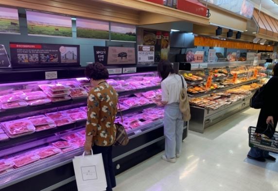 18일 정오 서울 송파구에 위치한 한 대형마트의 정육코너에서 고객들이 돼지고기를 살펴보고 있다.