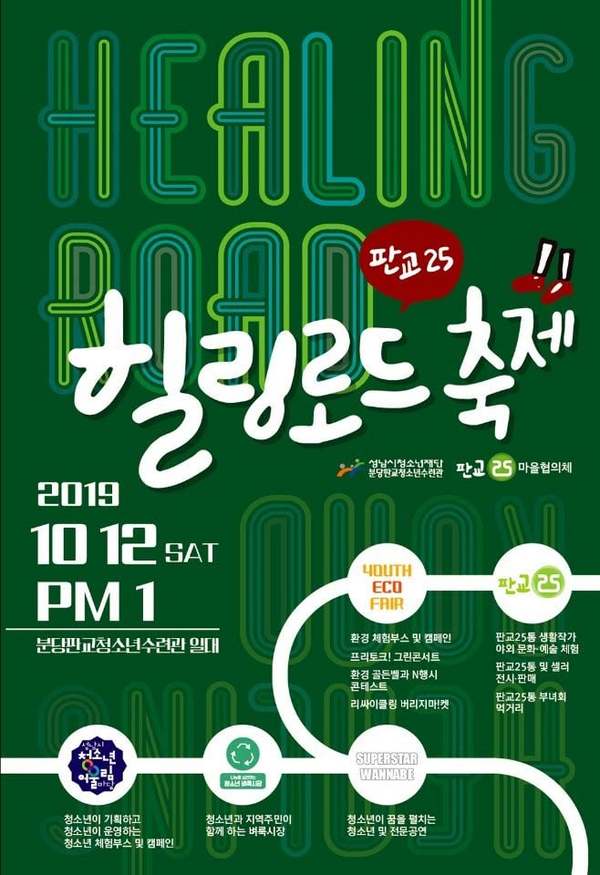 성남시 청소년재단(이사장 은수미) 분당 판교청소년수련관은 「판교 25通(통) 힐링 로드 축제」를 오는 10월 12일에 개최한다.