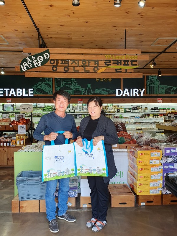 양평군은 지난 19일 양평친환경로컬푸드 직매장 장바구니 사용 캠페인에 따라 도로명주소홍보 장바구니를 전달하였다.