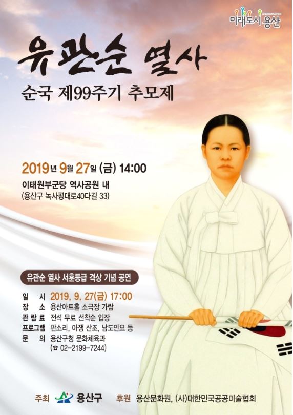 서울 용산구(구청장 성장현)가 오는 27일 유관순 열사 순국 제99주기 추모제 및 서훈등급 격상(1등급 추가 서훈) 기념공연을 연다.