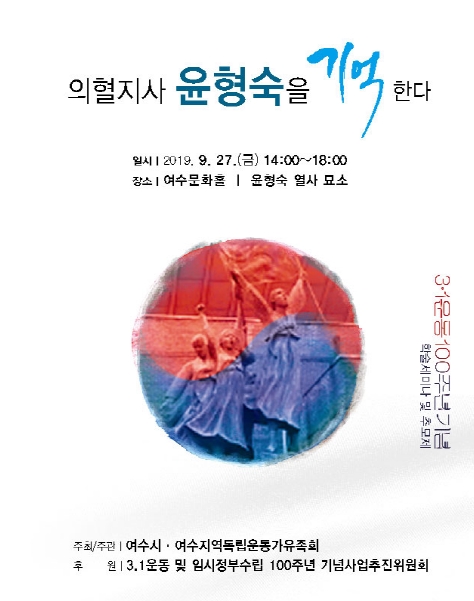 여수시는 3‧1운동 100주년을 기념해 오는 27일 오후 2시 여수문화홀에서 시민 500명이 참석한 가운데 윤형숙 열사 학술대회를 연다고 25일 밝혔다.