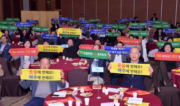 ▲ 지난 27일 디오션호텔에서 열린 ‘여수관광 친절 아카데미’에 참석한 음식‧숙박‧관광 업체 관계자와 사회단체 회원, 일반 시민 등 340여 명이 손 배너를 펼치며 구호를 제창하고 있다.