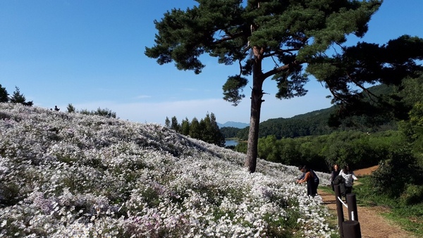 ○ 먼저 호수를 배경으로 하얀 구절초 언덕이 넓게 펼쳐진 가을 풍경이 압권이다.