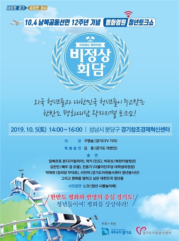 ‘평화대담 청년 토크쇼 비정상회담’이 오는 5일 오후 2시 판교 창조경제혁신센터 국제회의장에서 ‘한반도 평화와 번영의 중심 경기도, 청년들이여 평화를 상상하라’를 주제로 도내 청년과 도민 등 200여 명이 참석한 가운데 개최된다.