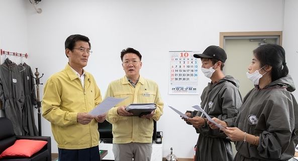 홍성열 군수(왼쪽 첫번째)가 거점 소독소를 방문하고 있다.(사진제공=증평군청)