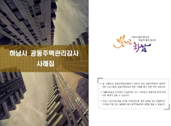 하남시는 공동주택관리법에서 정하고 있는 공동주택관리 업무에 관한 주요사항과 관리에 이해를 돕기 위한 ‘하남시 공동주택관리 감사 사례집’을 제작하여 홈페이지에 게시했다고 밝혔다.