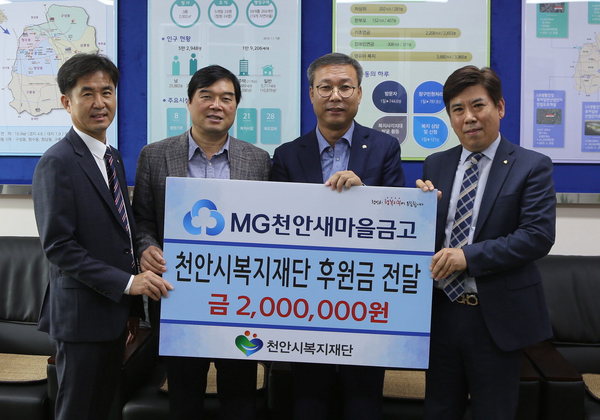 천안새마을금고(이사장 이재우)는 지난 15일 천안시복지재단에 청룡동 거주 취약계층지원을 위한 200만원을 후원하고 청룡동행정복지센터에서 전달식을 가졌다고 밝혔다.