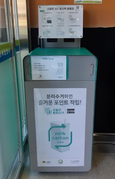 성동구(구청장 정원오)가 지난 14일부터 분리배출을 해야 자원으로 활용할 수 있는 종이팩 수거를 위해 ‘사물인터넷(IoT) 스마트 종이팩 수거함’을 시범 설치·운영한다고 밝혔다.