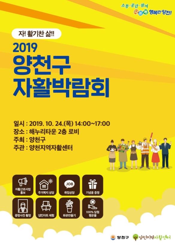 양천구(구청장 김수영)는 오는 24일(목) 오후 2시부터 5시까지 해누리타운(목동 동로 81) 2층 로비에서 ‘2019 양천구 자활박람회’를 개최한다.