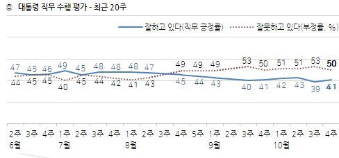 갤럽에 따르면, 지난 2017년 6월부터 12월까지 문 대통령의 직무 긍/부정률을 평균으로 계산한 결과는 76%/16%였고, 2018년 한 해는 65%/25%, 올해 1월부터 8월까지는 긍/부정률이 모두 40%대에 머물며 엎치락뒤치락했다(평균 46%/45%). 9월 추석 직후부터 이번 주까지 6주간 평균 긍/부정률은 41%/51%로, 부정률이 우세한 상태가 지속되고 있는 것으로 나타났다.