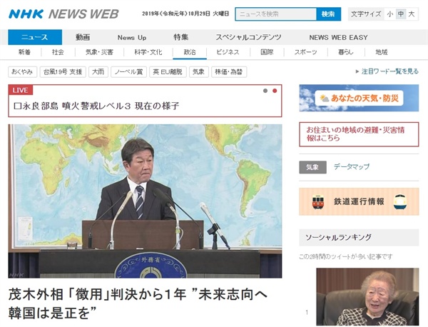 모테기 도시미쓰 일본 외무상의 일제 강제징용 피해 배상 판결 관련 발언을 보도하는 NHK 뉴스 갈무리.