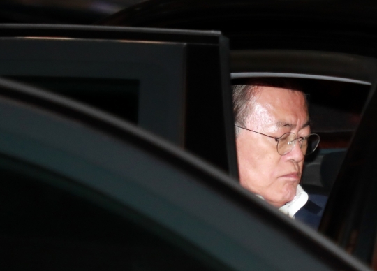 문재인 대통령이 29일 오후 모친인 강한옥(92) 여사의 별세를 지켜본 뒤 부산의 한 병원을 나서고 있다.