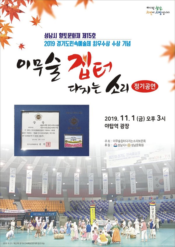 성남지역의 대표적인 향토민속놀이인 성남시 향토 문화재 제15호 '이무술 집터다지는 소리' 2019 정기공연이 11.1(금) 오후 3시, 야탑역 광장에서 열린다.