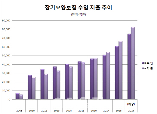 장기요양보험은 수급자 급증으로 2016년부터 당기수지 적자가 발생했고, 올해 예상 적자액은 7천530억원이다. 적자는 그간 쌓아둔 적립금으로 메워왔지만 올해 말이 되면 적립금도 0.6개월(18일) 운영비 정도만 남게 된다.