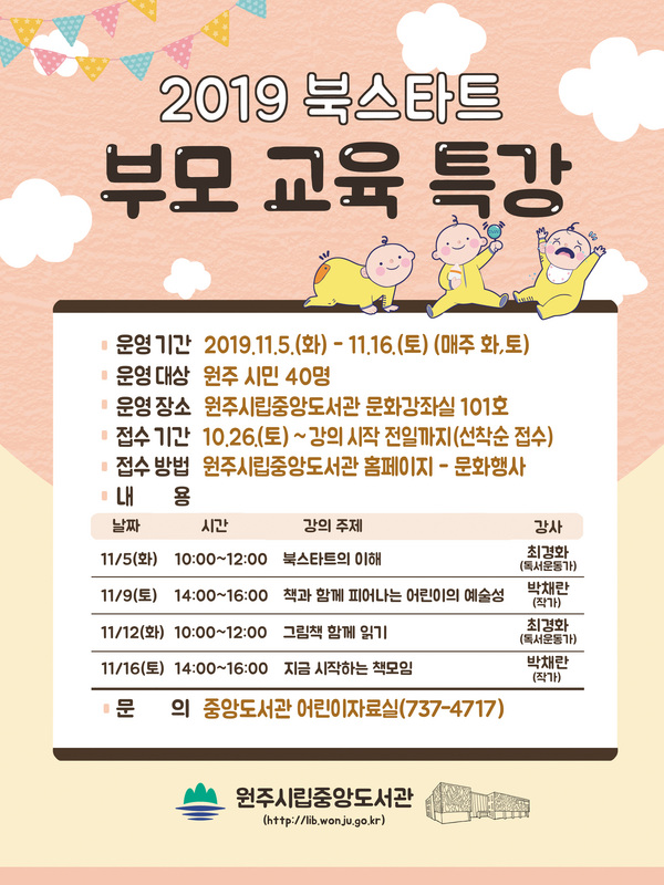 □ 원주시립중앙도서관이 북스타트 프로그램의 일환으로 11월 5일부터 16일까지 ‘2019 북스타트 부모교육 특강’을 운영한다.
