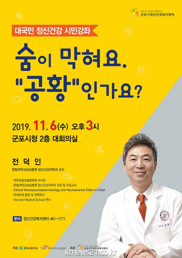 ‘숨이 막혀요, 공황인가요?’라는 주제의 강연을 군포시정신건강복지센터 주관으로, 11월 6일 군포시청 2층 대회의실에서 진행할 예정이다.