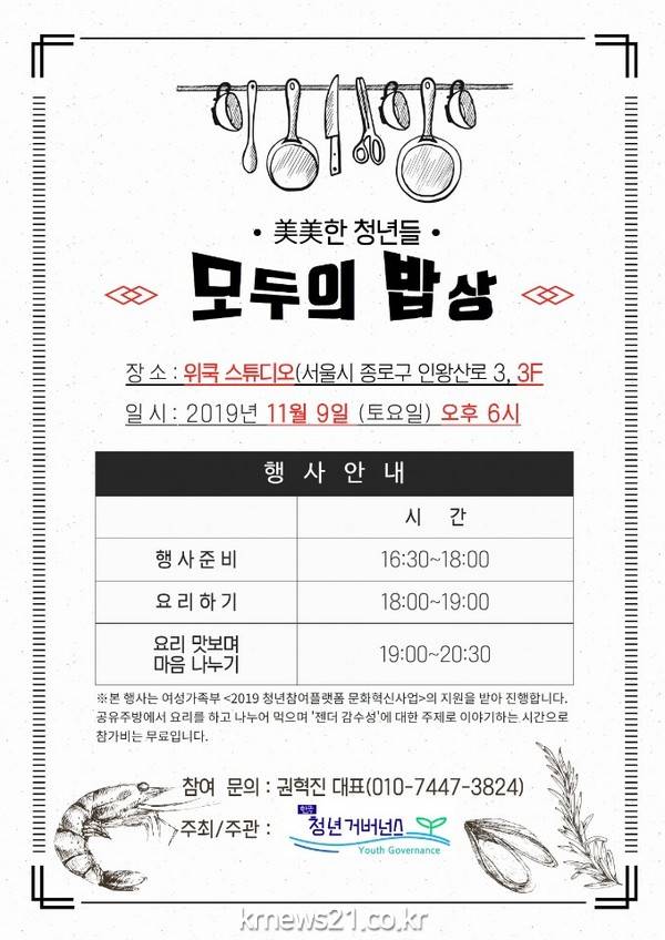 한국 청년 거버넌스(대표 권혁진)는 보도자료를 통해 오는 9일 서울시 종로구에 소재한 위쿡 스튜디오라는 공유주방 플랫폼에서 ‘美美한 청년들, 모두의 밥상’이라는 젠더 갈등 해소를 위한 프로그램 사업을 개최할 계획임을 알렸다.