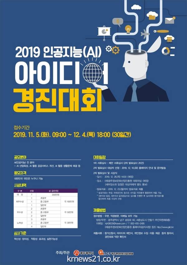 접수는 5일부터 12월4일까지 (재)광주정보문화산업진흥원 홈페이지에서 참가신청서와 아이디어 제안서를 내려받아 우편(광주시 남구 송암로 60, AI 중심도시 광주만들기 추진위원회), 방문, 이메일(kjh06031@naver.com)로 하면 된다.