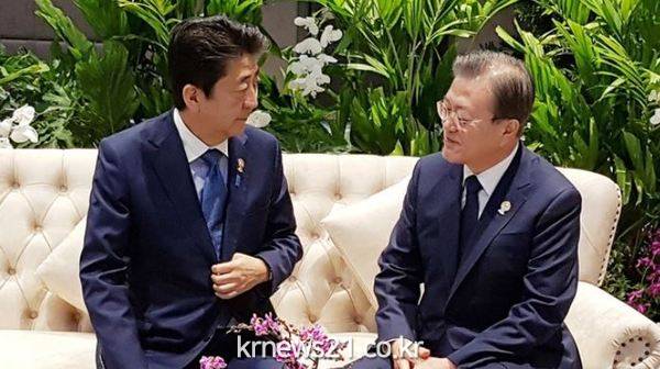 스가 요시히데(菅義偉) 일본 관방장관은 5일 오전 정례브리핑에서 전날 태국 방콕에서의 한·일 정상 환담에 대해 "아베 신조(安倍晋三) 총리는 일본의 원칙적인 입장을 문재인 대통령에게 확실하게 전달했다"며 "(그동안의) 일관된 입장을 기초로 한국에 현명한 대응을 요구하는 일본의 입장엔 변화가 없다"고 5일 말했다.